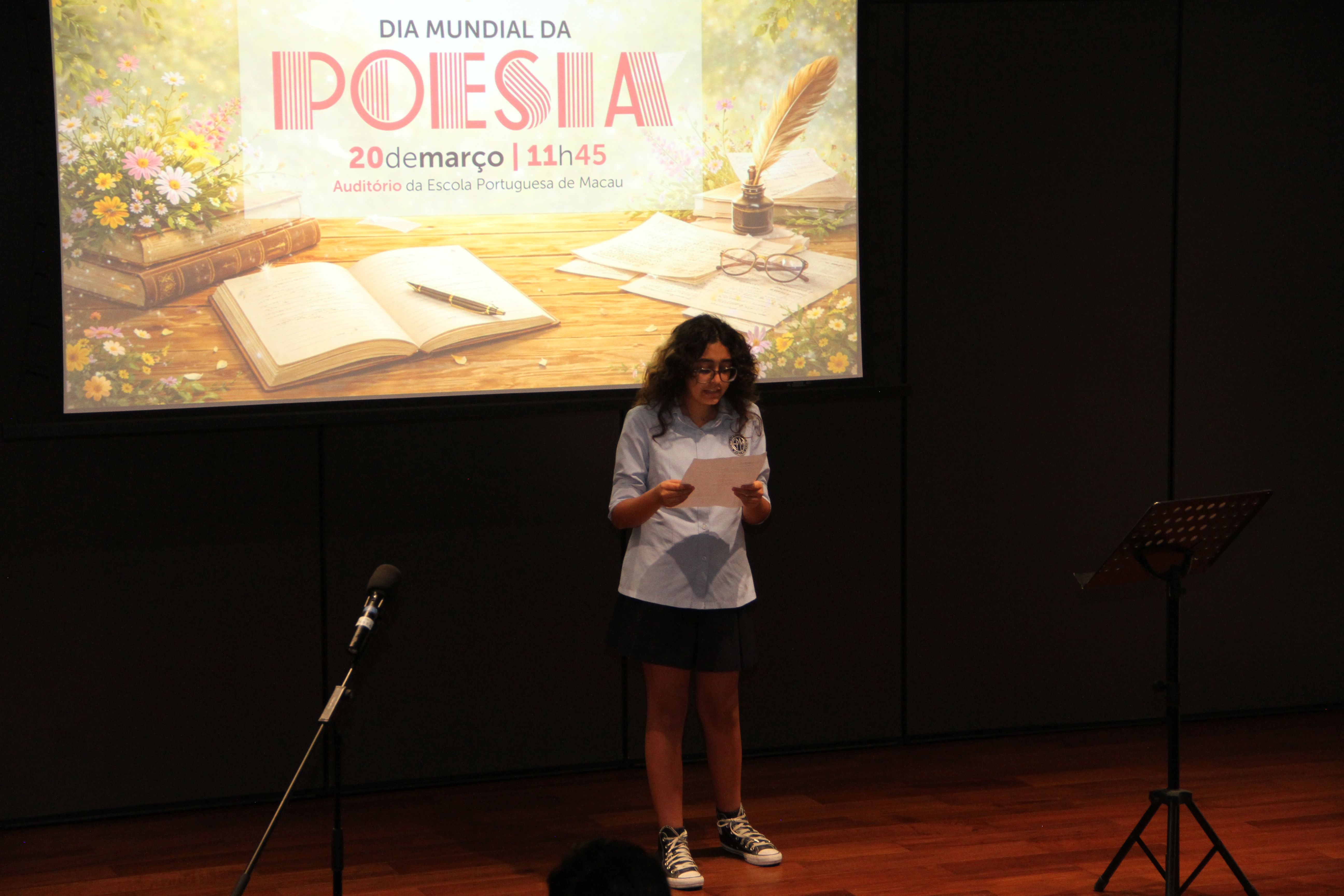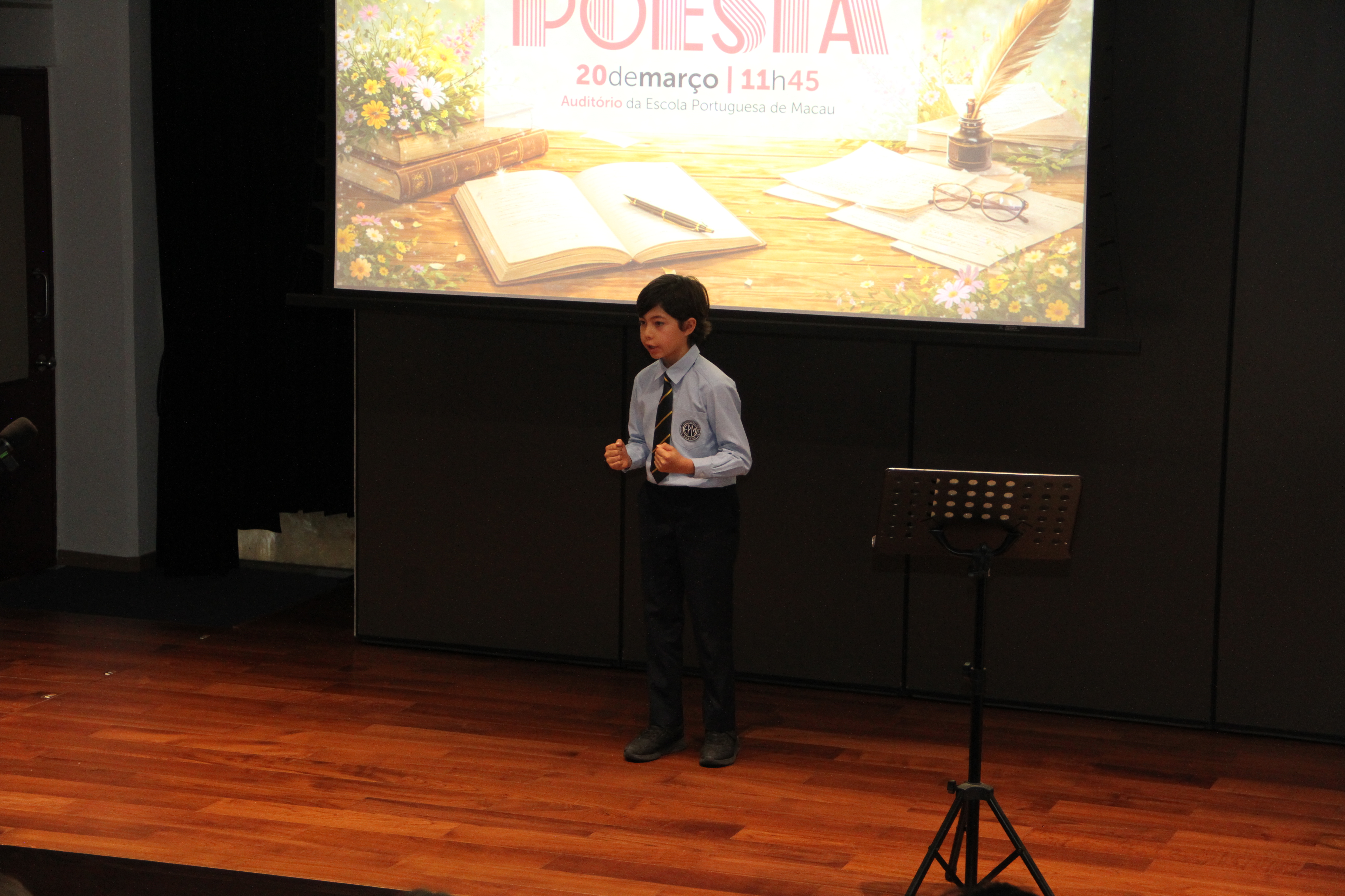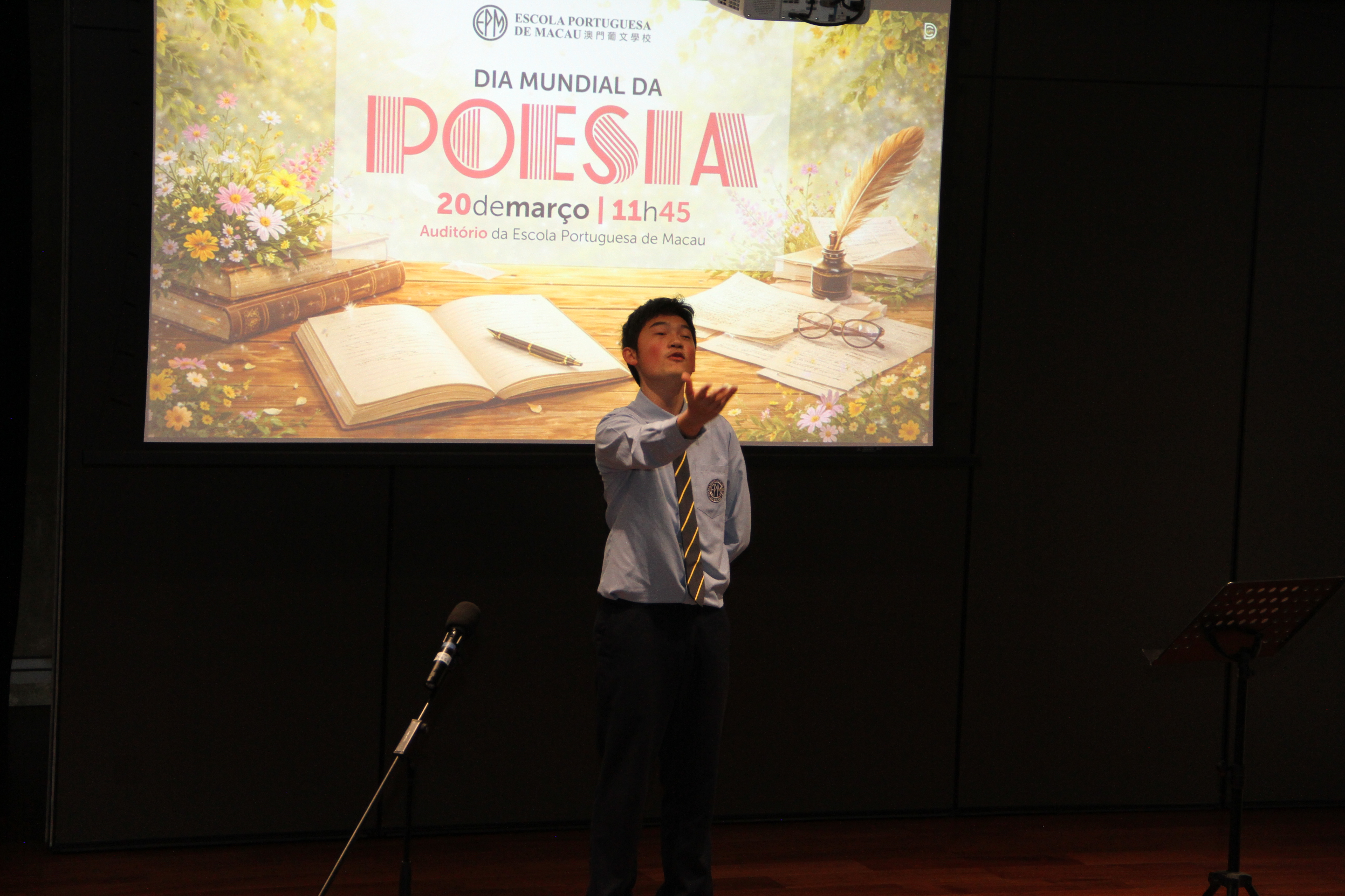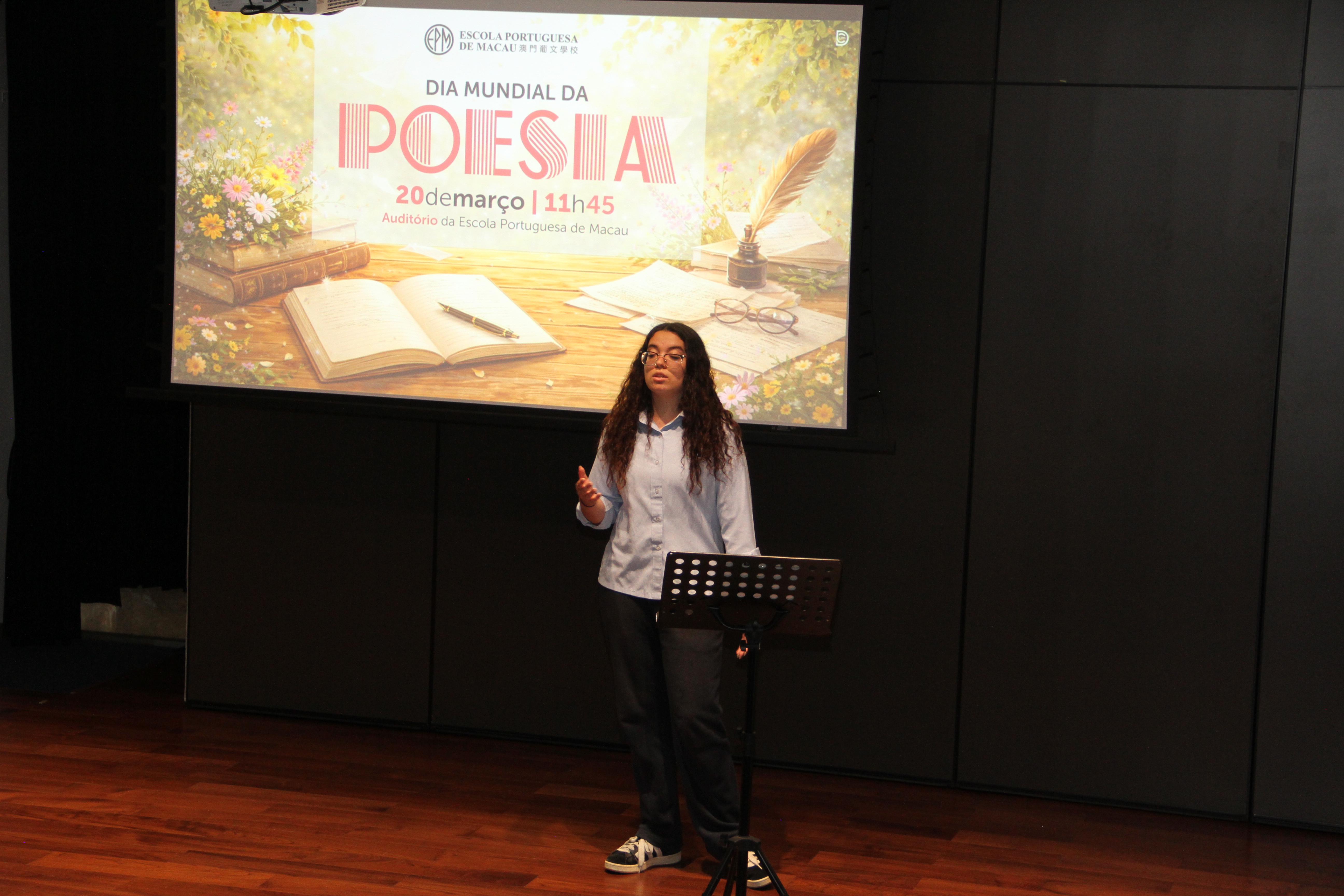 No dia 20 de março, o auditório encheu-se de emoção para assistir à quarta edição da Declamação de Poesia. Alunos e professores, lado a lado, declamaram poemas em várias línguas, revelando que a palavra não conhece fronteiras. Cada interpretação foi um sopro de intensidade, vibrante e emotivo, arrancando aplausos que ecoaram como testemunho da força da poesia. O evento abriu com o Jardim de Palavras, onde os premiados do XXIII Concurso de Declamação de Poesia da EPM, numa verdadeira simbiose poética, declamaram os seus poemas num só! Da arte se fez nova arte, um momento que arrepiou todos os presentes. Este evento fechou com um poema coletivo, em inglês, da autoria dos alunos do 9.º ano, sobre “Freedom”, demonstrando que a poesia nasce em cada um de nós!