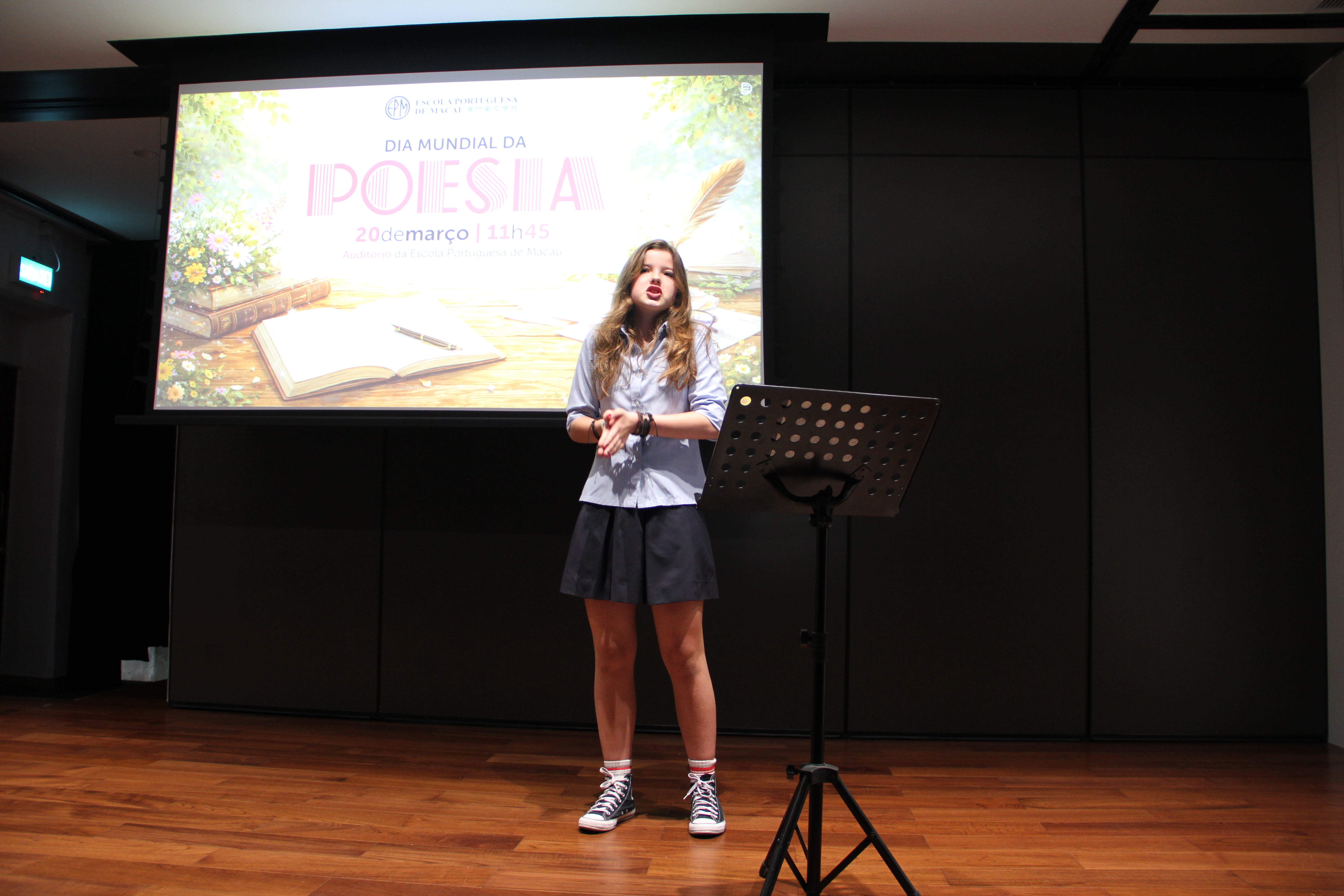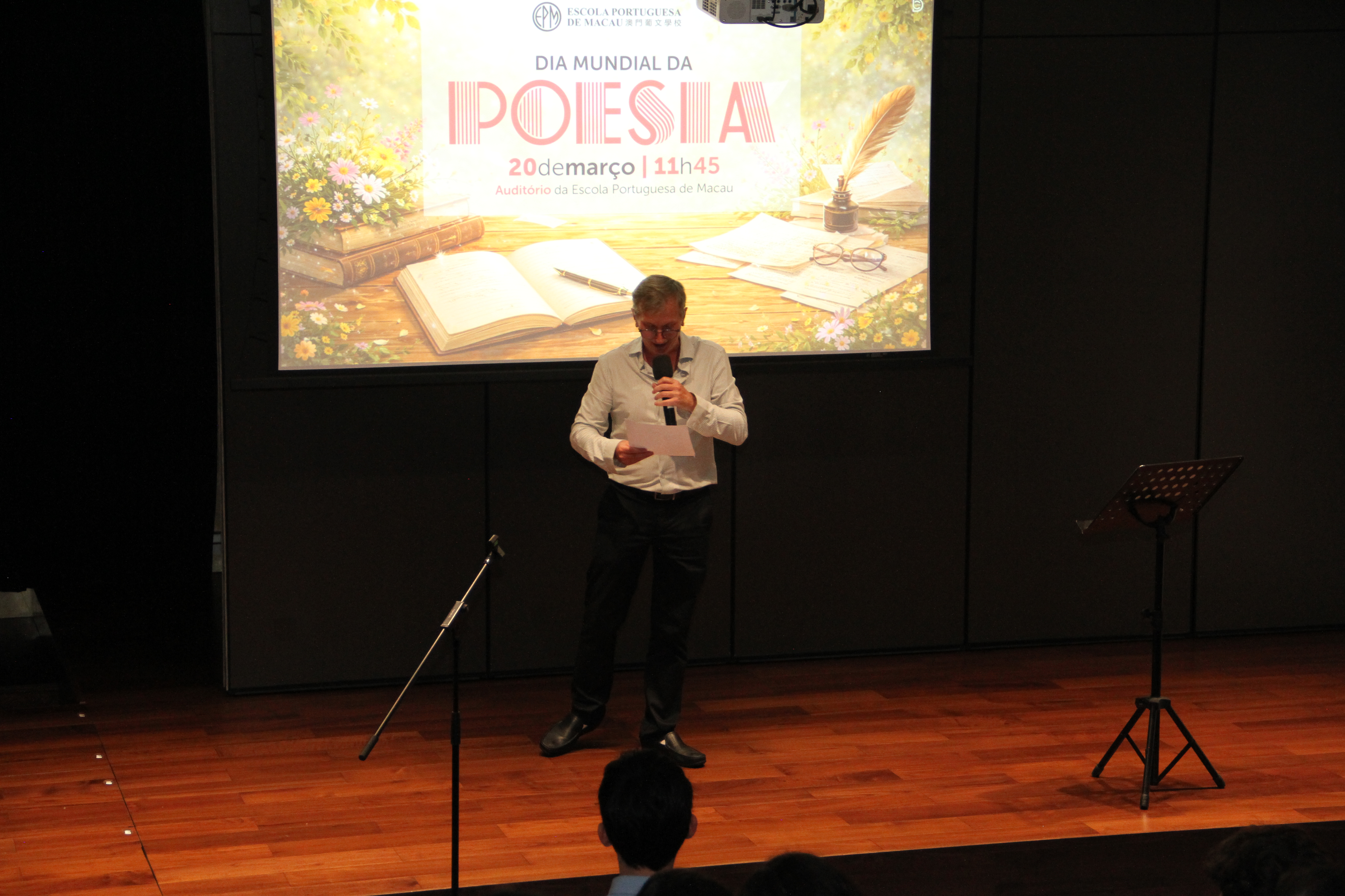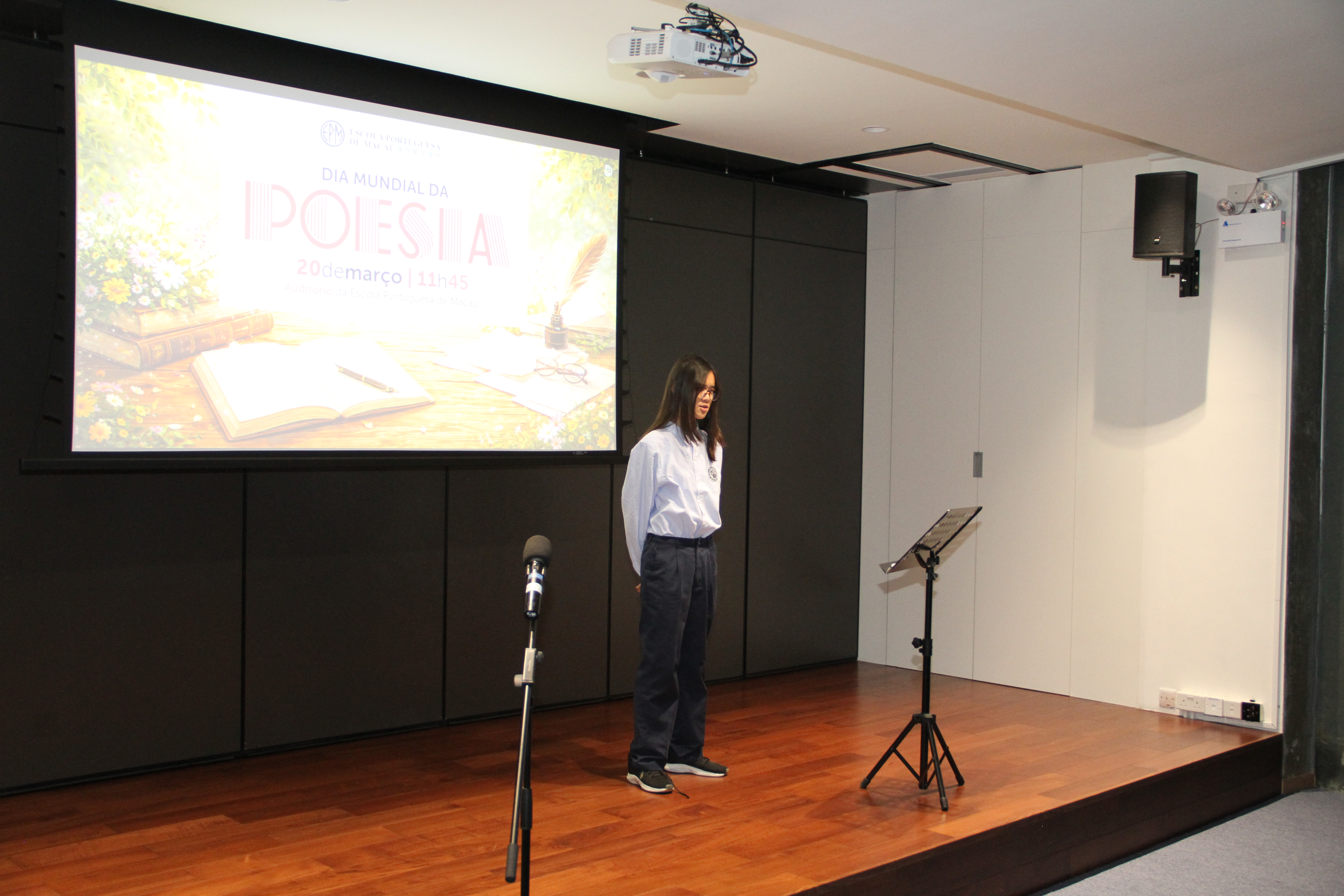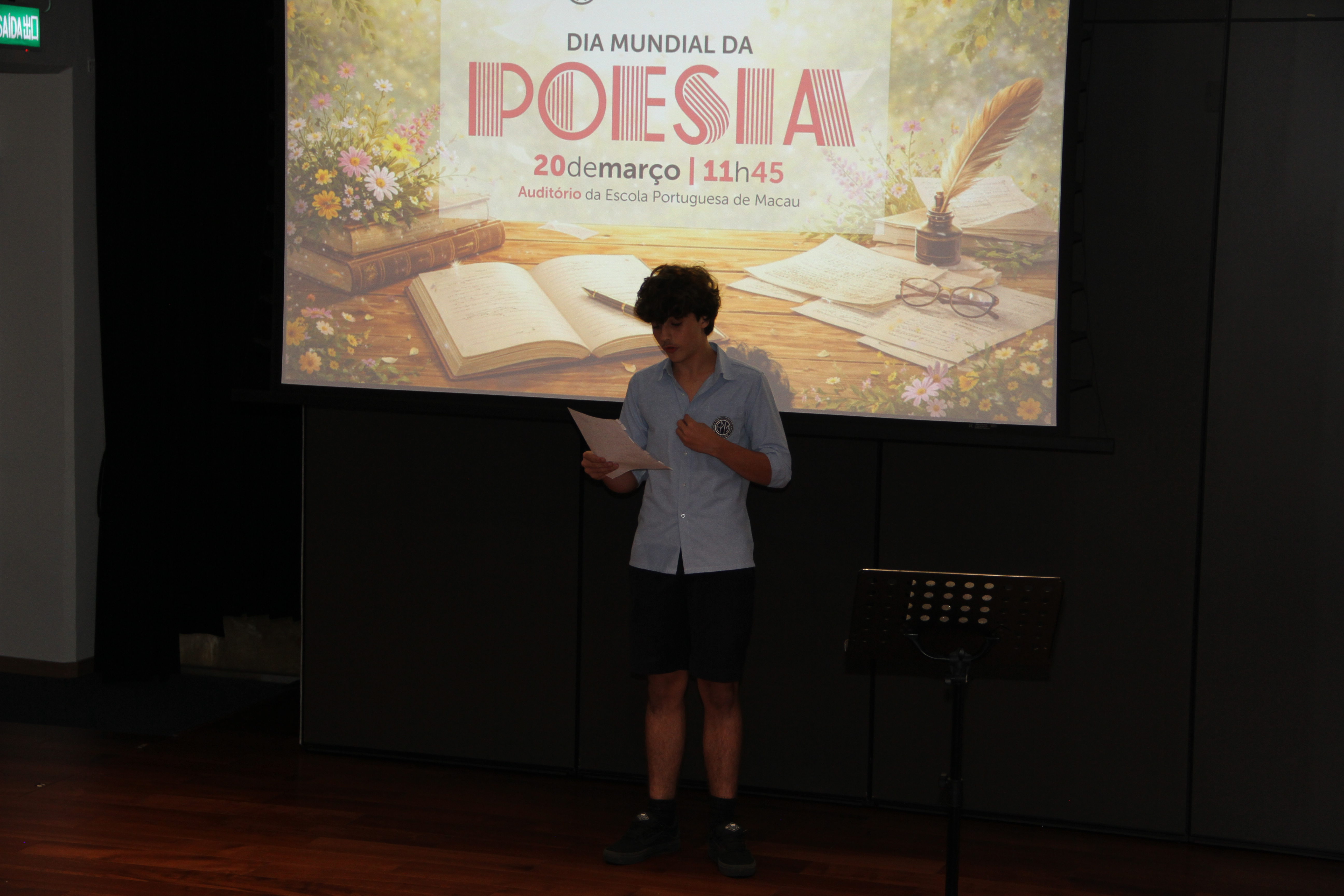No dia 20 de março, o auditório encheu-se de emoção para assistir à quarta edição da Declamação de Poesia. Alunos e professores, lado a lado, declamaram poemas em várias línguas, revelando que a palavra não conhece fronteiras. Cada interpretação foi um sopro de intensidade, vibrante e emotivo, arrancando aplausos que ecoaram como testemunho da força da poesia. O evento abriu com o Jardim de Palavras, onde os premiados do XXIII Concurso de Declamação de Poesia da EPM, numa verdadeira simbiose poética, declamaram os seus poemas num só! Da arte se fez nova arte, um momento que arrepiou todos os presentes. Este evento fechou com um poema coletivo, em inglês, da autoria dos alunos do 9.º ano, sobre “Freedom”, demonstrando que a poesia nasce em cada um de nós!