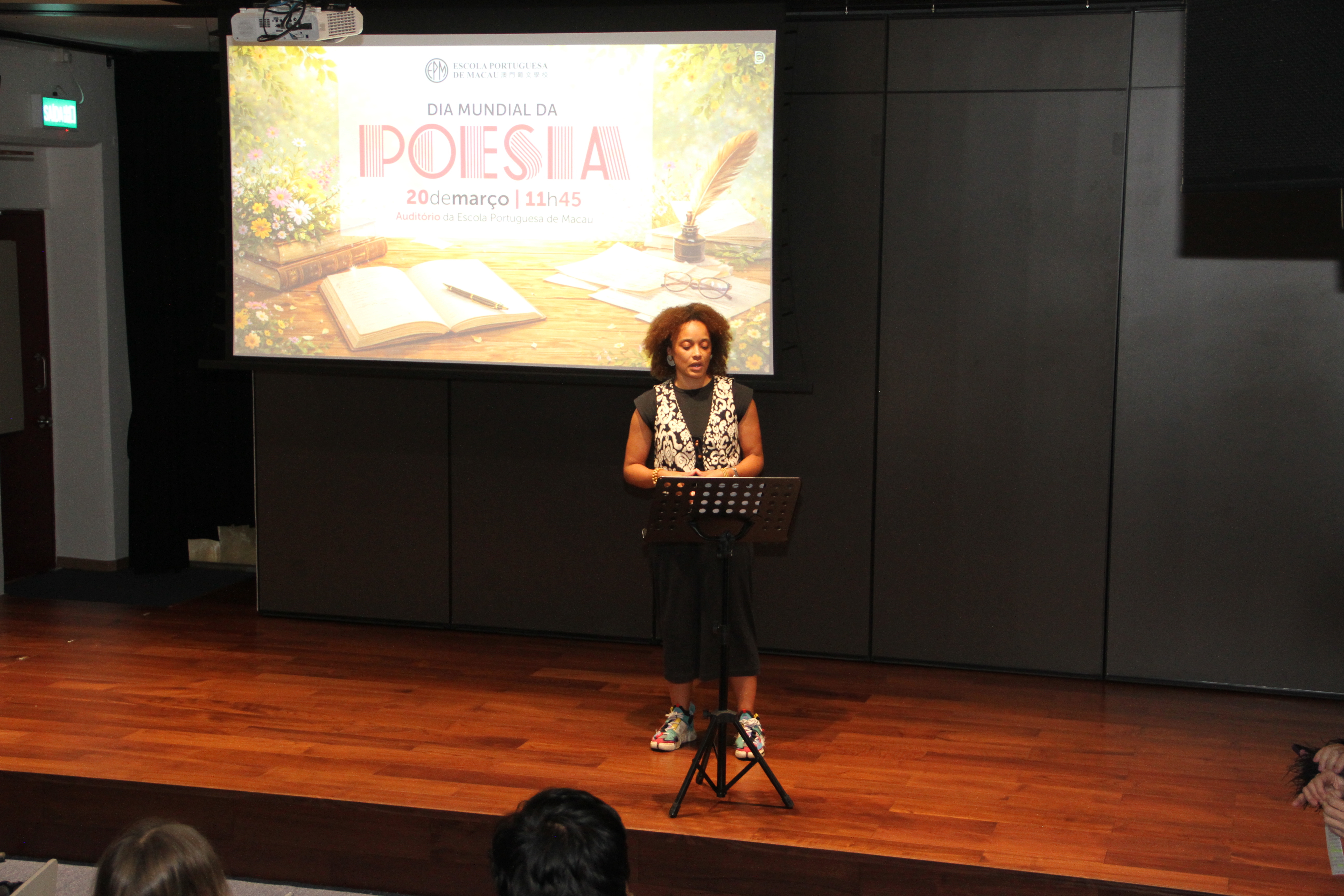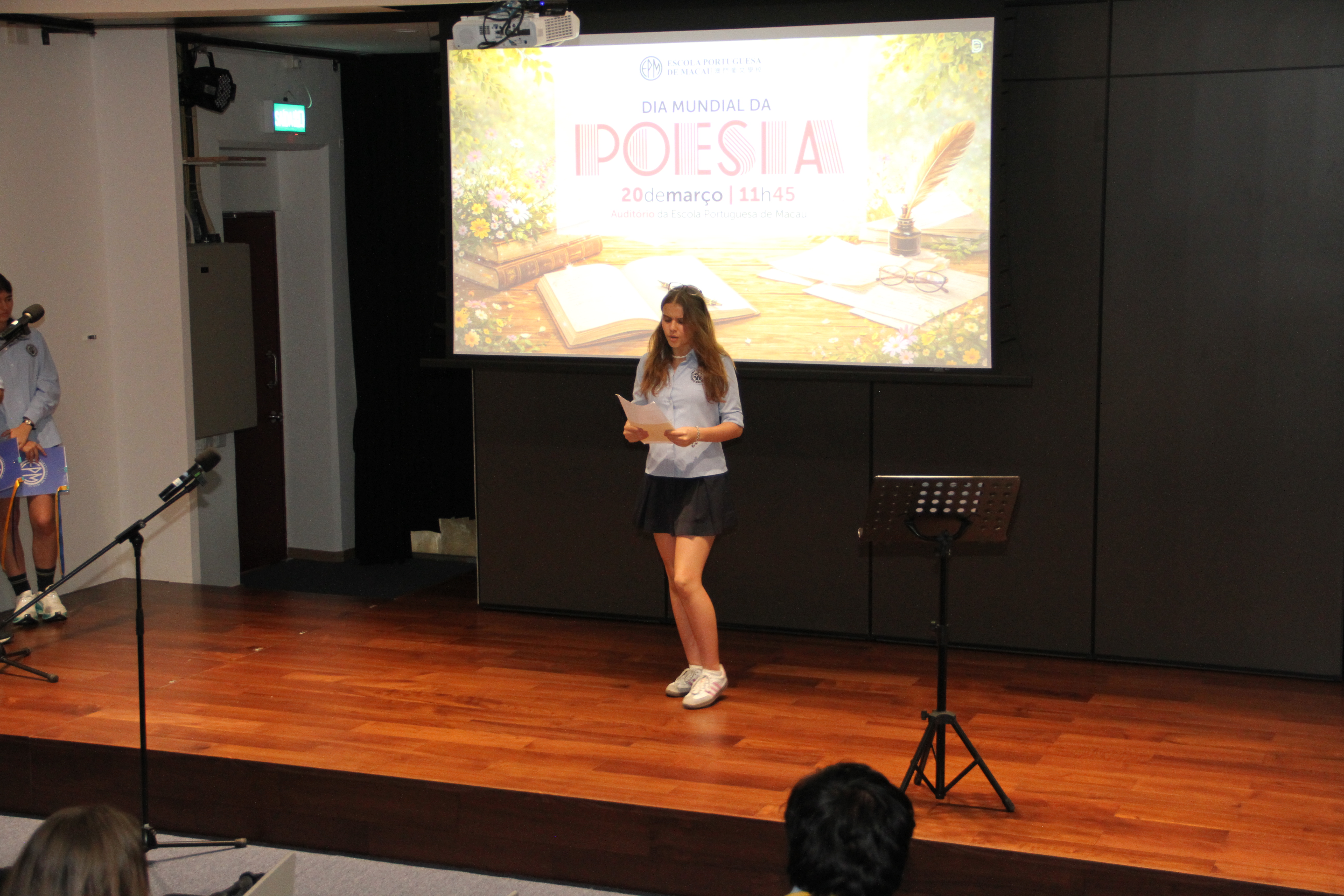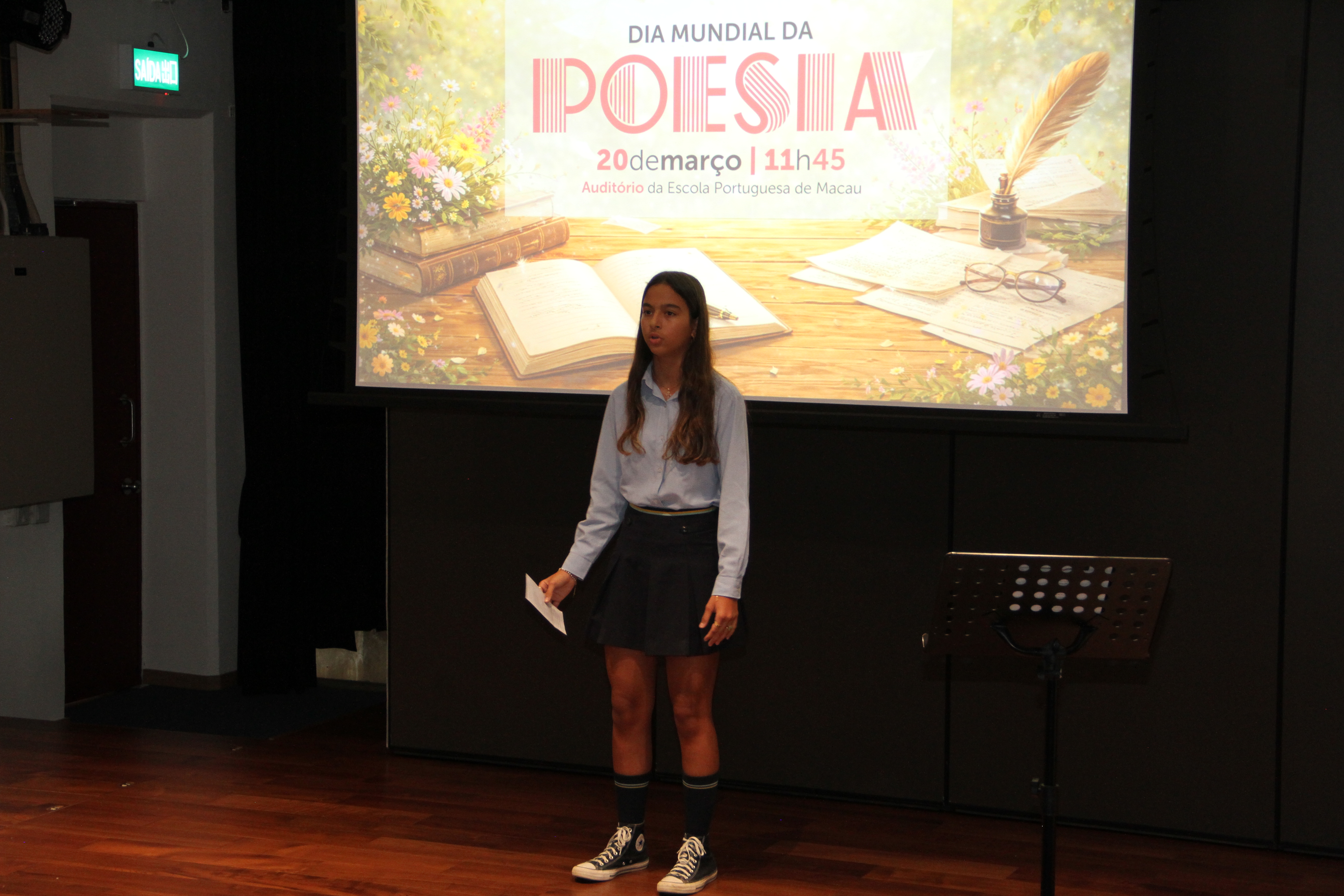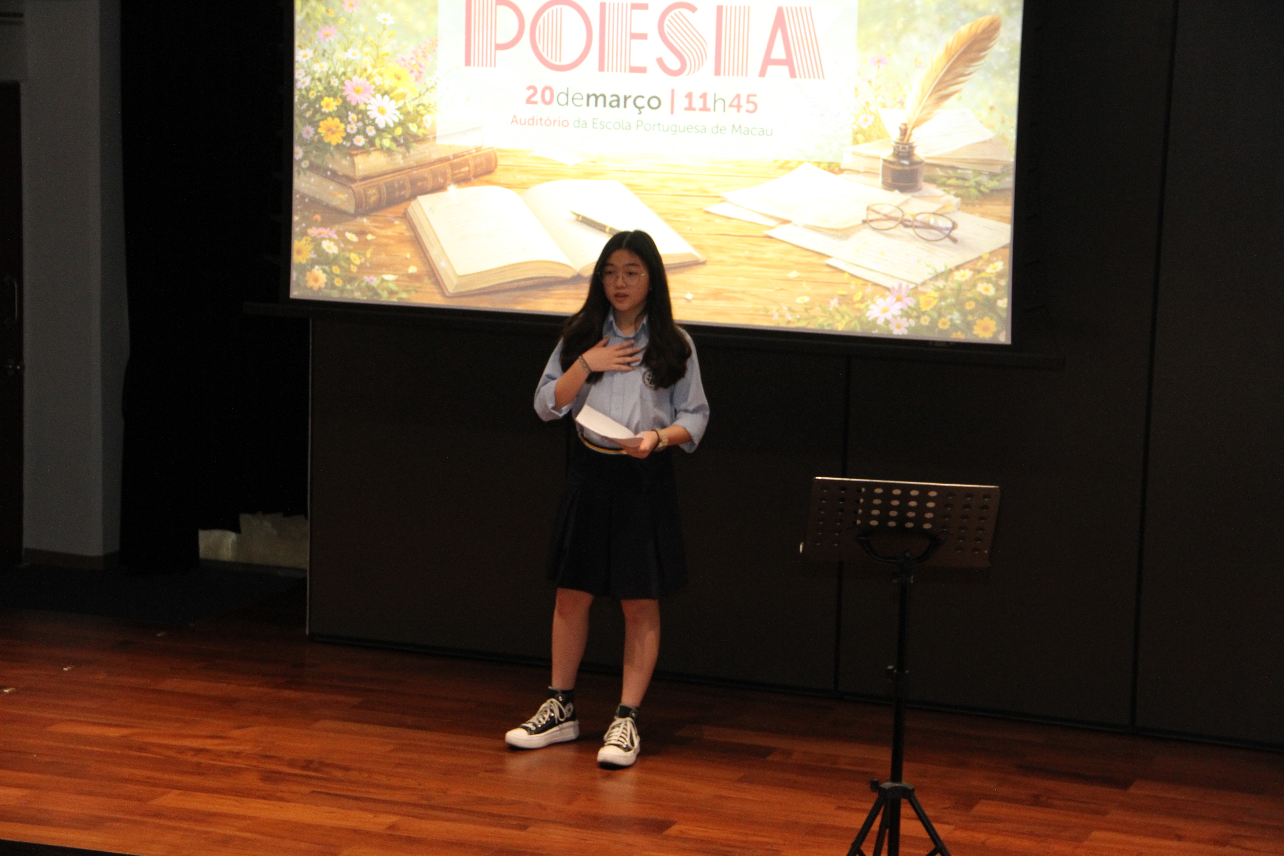 No dia 20 de março, o auditório encheu-se de emoção para assistir à quarta edição da Declamação de Poesia. Alunos e professores, lado a lado, declamaram poemas em várias línguas, revelando que a palavra não conhece fronteiras. Cada interpretação foi um sopro de intensidade, vibrante e emotivo, arrancando aplausos que ecoaram como testemunho da força da poesia. O evento abriu com o Jardim de Palavras, onde os premiados do XXIII Concurso de Declamação de Poesia da EPM, numa verdadeira simbiose poética, declamaram os seus poemas num só! Da arte se fez nova arte, um momento que arrepiou todos os presentes. Este evento fechou com um poema coletivo, em inglês, da autoria dos alunos do 9.º ano, sobre “Freedom”, demonstrando que a poesia nasce em cada um de nós!